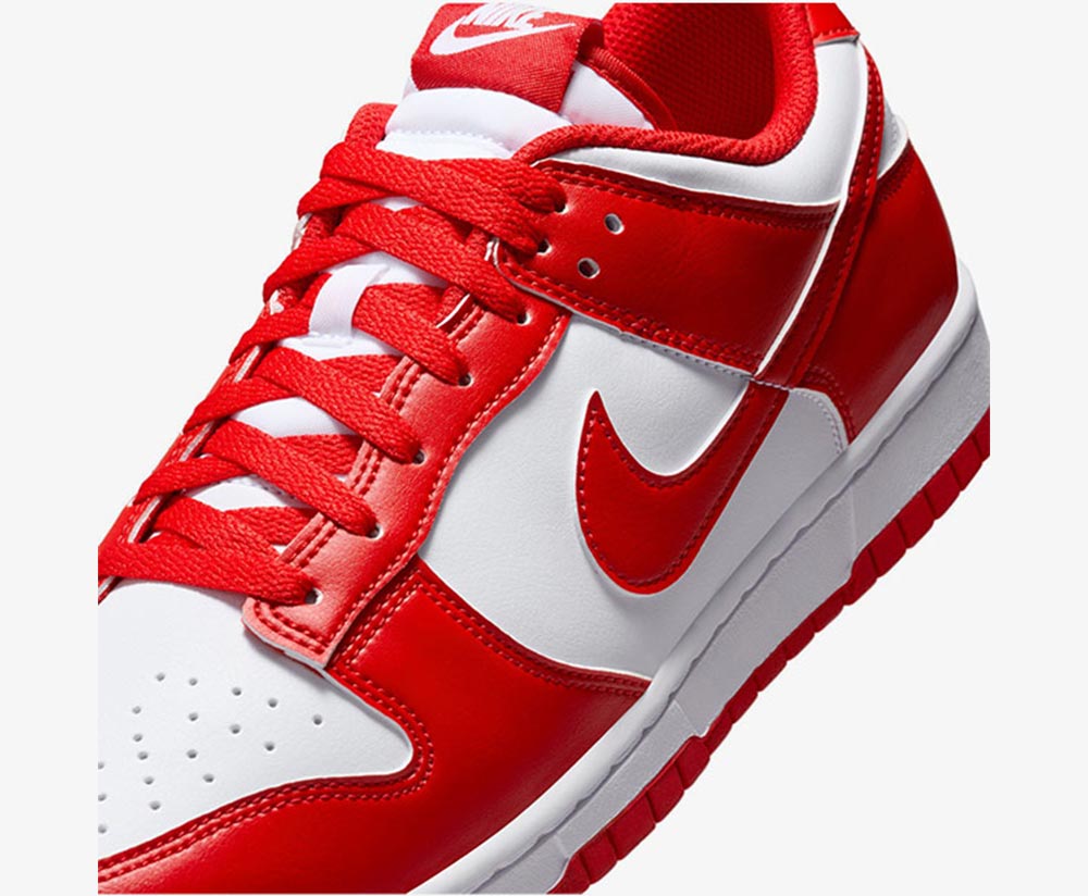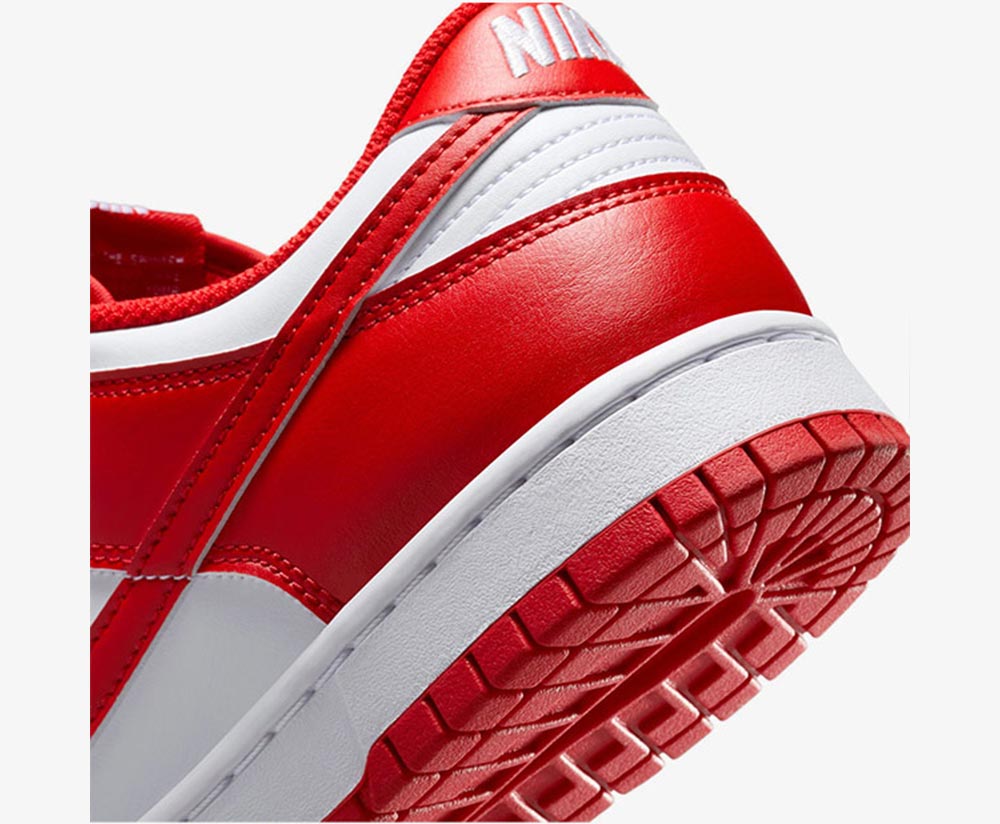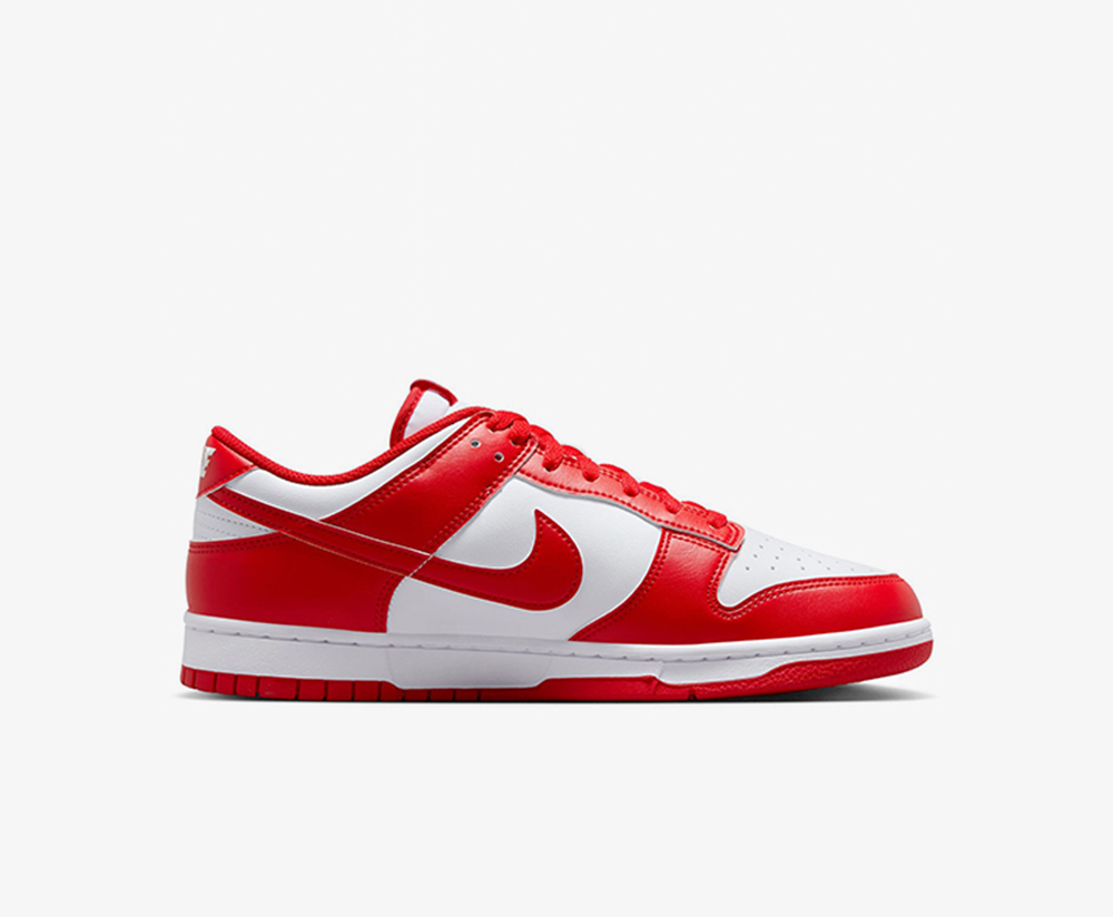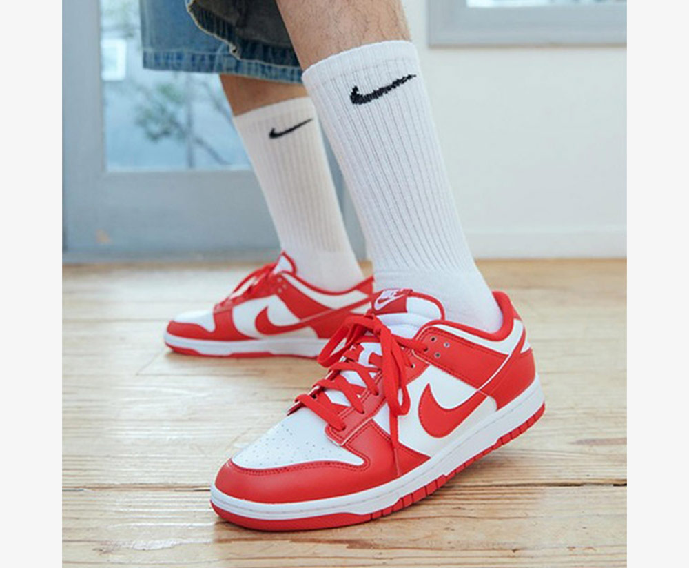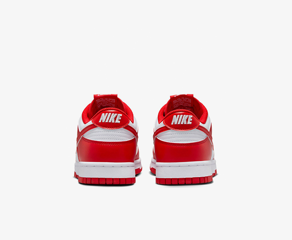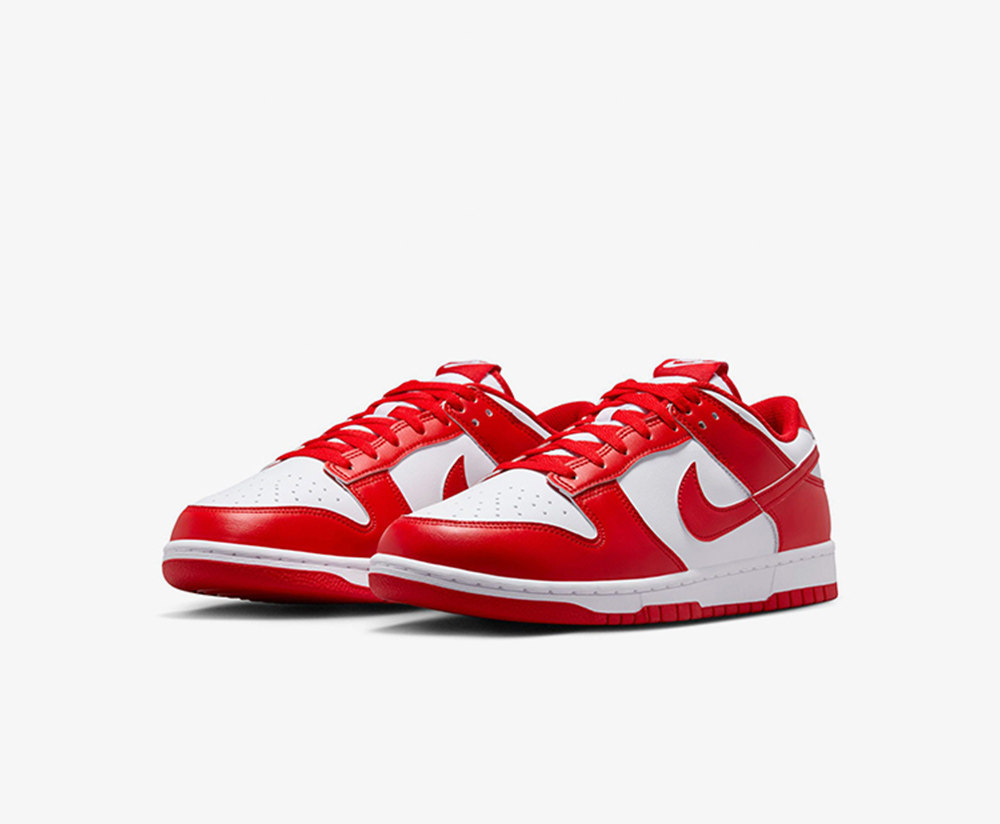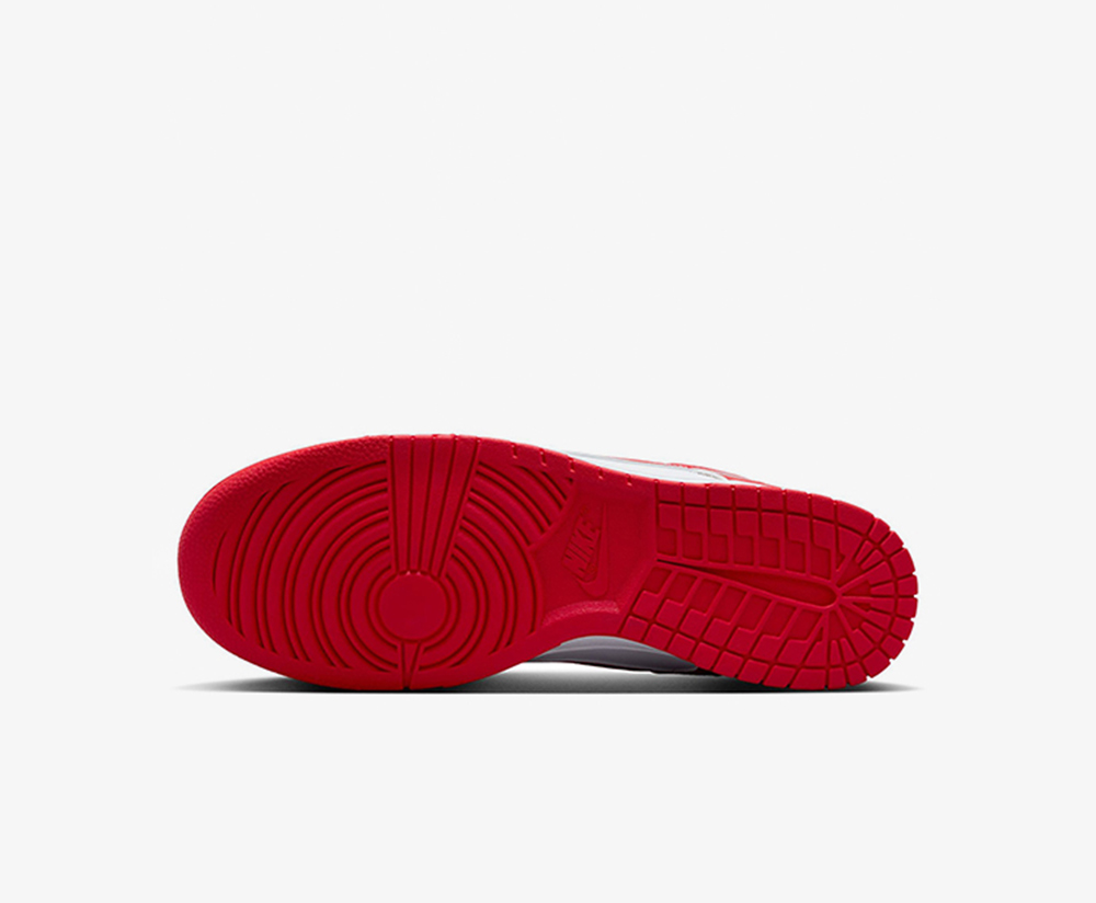 Form được thiết kế cổ thấp gọn gàng, phù hợp cho hoạt động thường ngày và thể thao nhẹ. Swoosh màu đỏ nổi bật trên nền trắng, tạo điểm nhấn đặc trưng của dòng Dunk Low. Đế ngoài cao su đỏ kết hợp midsole trắng, rãnh vân chống trượt tốt, giúp tăng độ ổn định và linh hoạt.