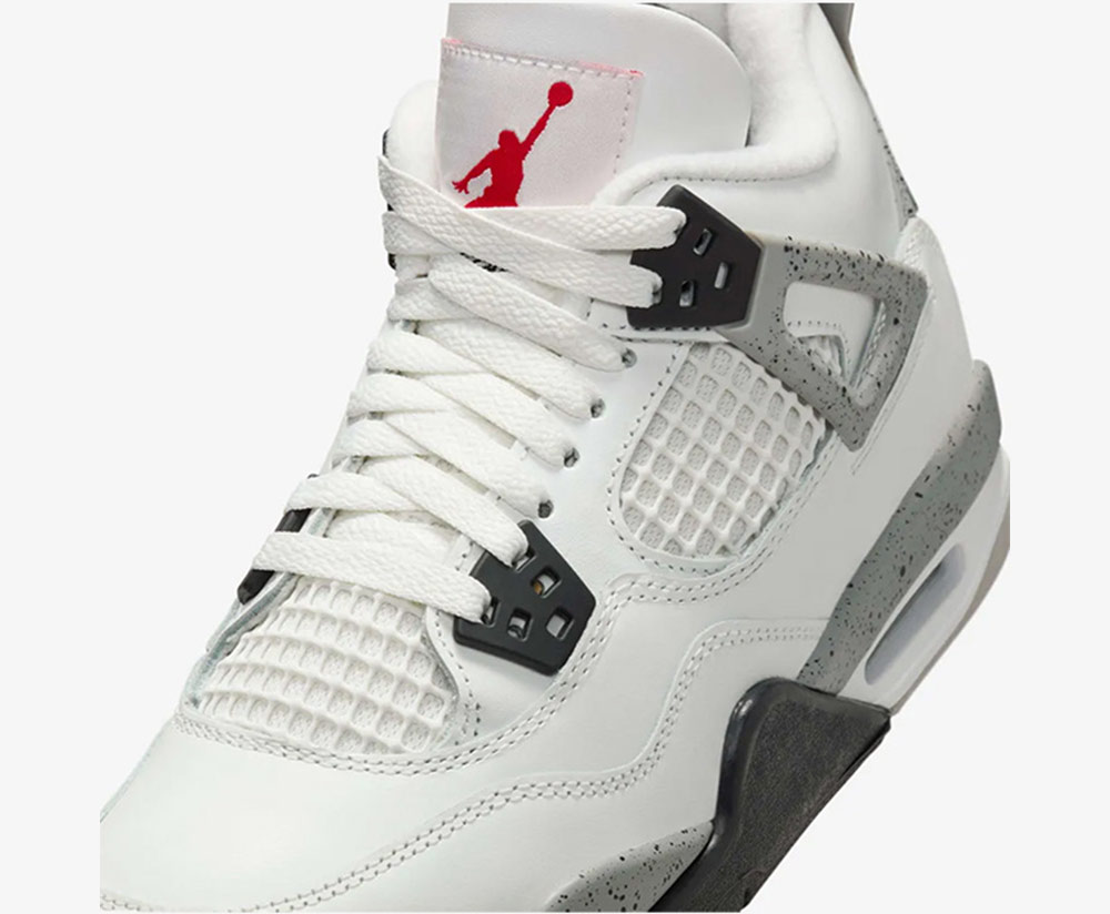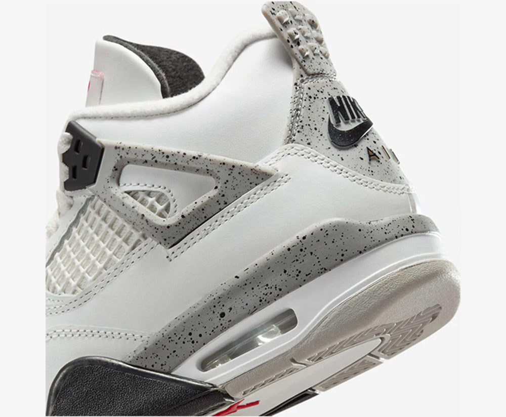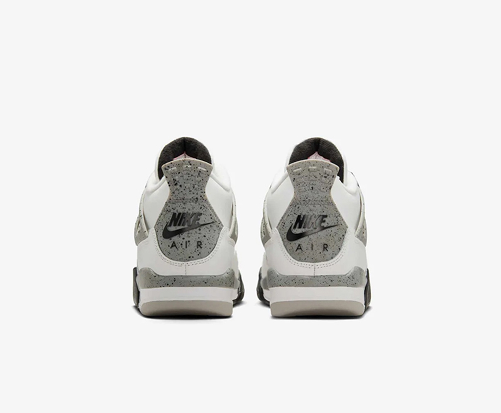 Điểm nhấn đặc trưng của Air Jordan 4 Retro OG Gs 'White Cement' nằm ở phần midsole xám vân loang (cement), đi kèm chi tiết eyelets và heel tab màu xám nổi bật trên nền trắng tinh tế. Sự tương phản này tạo nên vẻ ngoài mạnh mẽ nhưng vẫn giữ được sự tinh giản, giúp đôi giày dễ dàng phối với nhiều phong cách outfit khác nhau. Ngoài ra, logo Jumpman ở phần gót giày và chi tiết vệt loang quen thuộc gợi nhớ đến bản gốc năm 1989, mang đến giá trị sưu tầm cao cho các tín đồ sneakers.