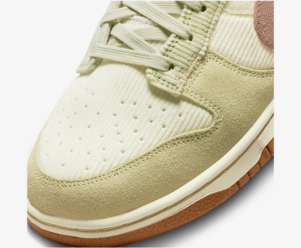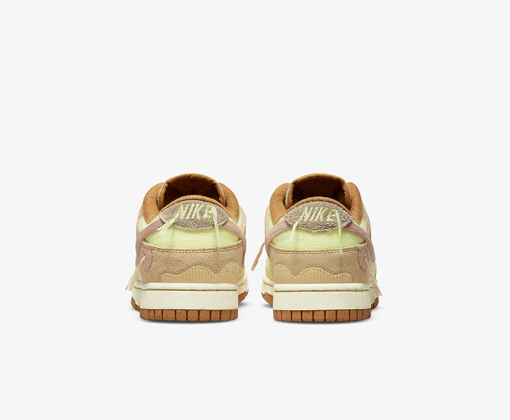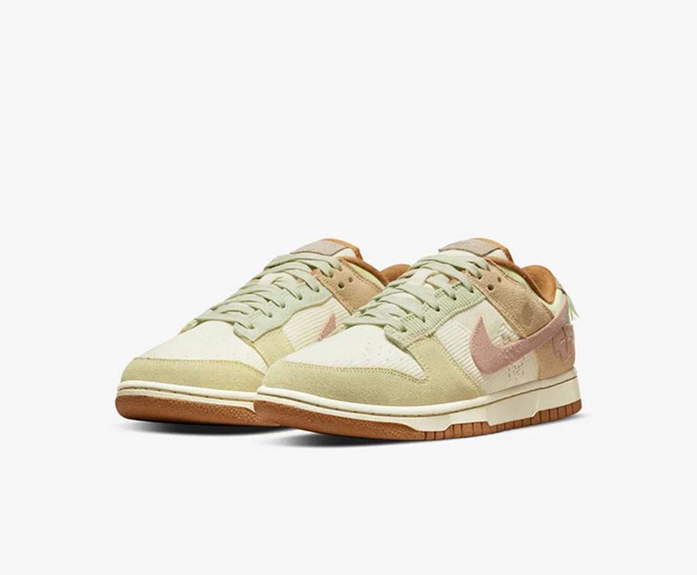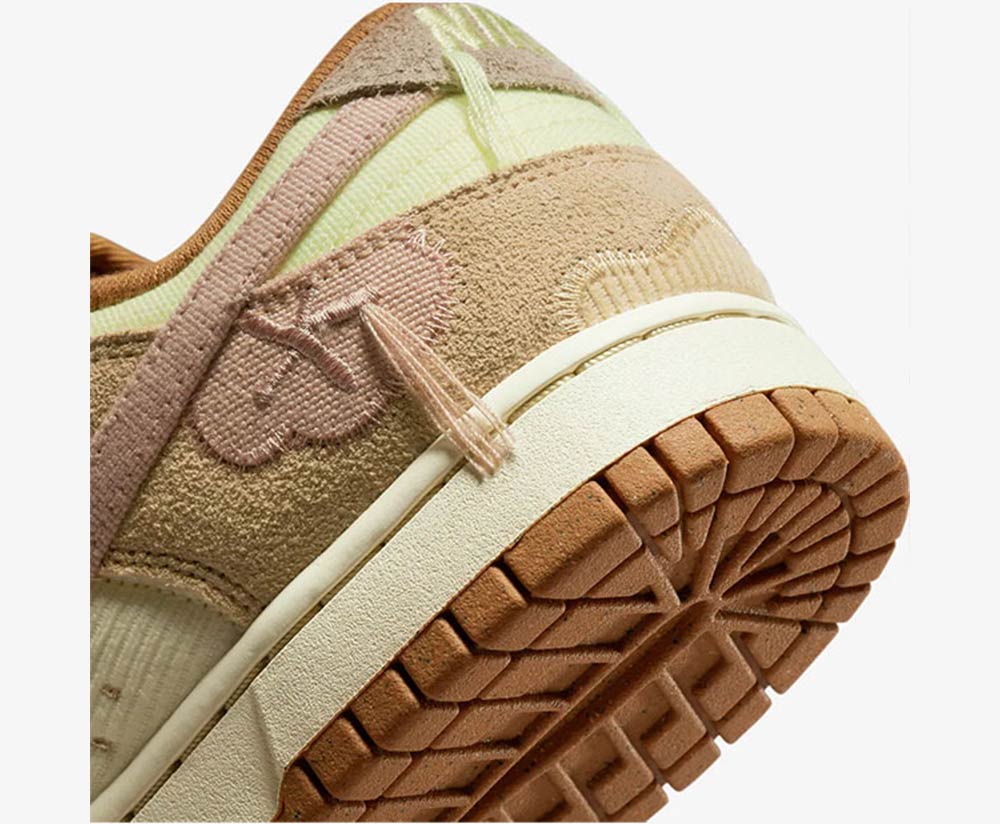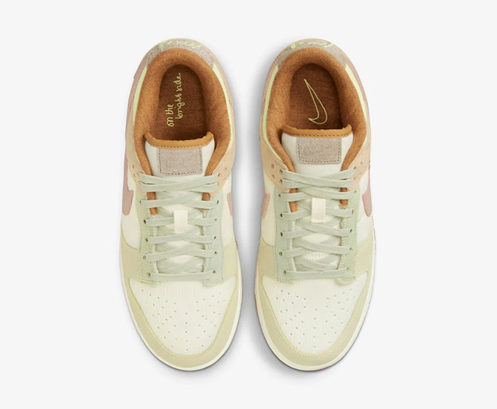 Phiên bản này được phối màu Coconut Milk, Bio Beige và Sail tạo nên tổng thể hài hòa, dễ phối hợp cùng nhiều outfit khác nhau. Điểm nhấn đặc biệ của Nike Wmns Dunk Low 'On The Bright Side' là phần thêu thủ công ở gót giày với những sợi chỉ buông đầy ngẫu hứng, mang lại cảm giác nghệ thuật và cá tính. Phần Swoosh logo và cổ giày phủ vải corduroy gân sọc, tạo hiệu ứng thị giác thú vị. Ngoài ra, chất liệu suede mềm mại ở các lớp phủ không chỉ nâng tầm thiết kế mà còn tăng độ bền khi sử dụng.